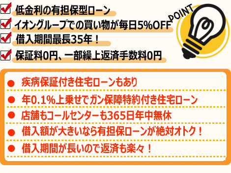 リフォームする物件にイオン銀行を第一順位の抵当権を設定することが必要になりますが、無担保型のリフォームローンに比べて、圧倒的低金利です。